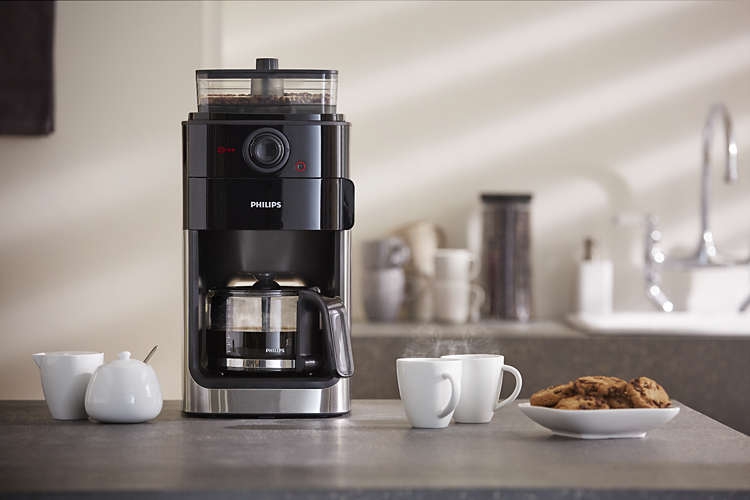 После качественного помола кофе просыпается в специальную воронку, предварительно в которую вложен бумажный фильтр. Проливая горячую воду необходимой температуры происходит экстракция. Вода изначально наливается в специальный отсек в кофеварке, где и нагревается. После заваривания напиток проливается в стеклянный графин объёмом 1,2 л. Объём кофе приготовляемый кофеваркой Philips Grind and Brew за один раз рассчитан на 10 порций, что позволяет кофеварке быть очень актуальной в офисе и в офисной жизни.10 минут — и 10 человек пьют кофе. Под кофейником находится площадка, которая может сохранять кофе горячим, пока Вы не отключите кофеварку.